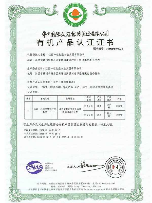 有機產品認證證書